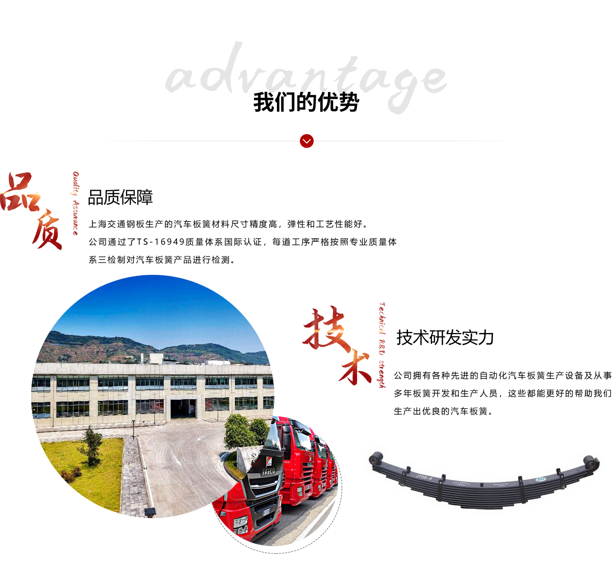 我們以其奇特的生產工藝在同行業中獨樹一幟,其產品一直供不應求,深受顧客青睞。公司主要生產銷售汽車鋼板彈簧東風汽車板簧等。我們的企業精神:科技興業、質量為本、追求卓越、誠實守信;以顧客為關注焦點、保護環境、造福社會是企業努力的方向;全公司將用:一如既往、開拓新穎的企業精神……